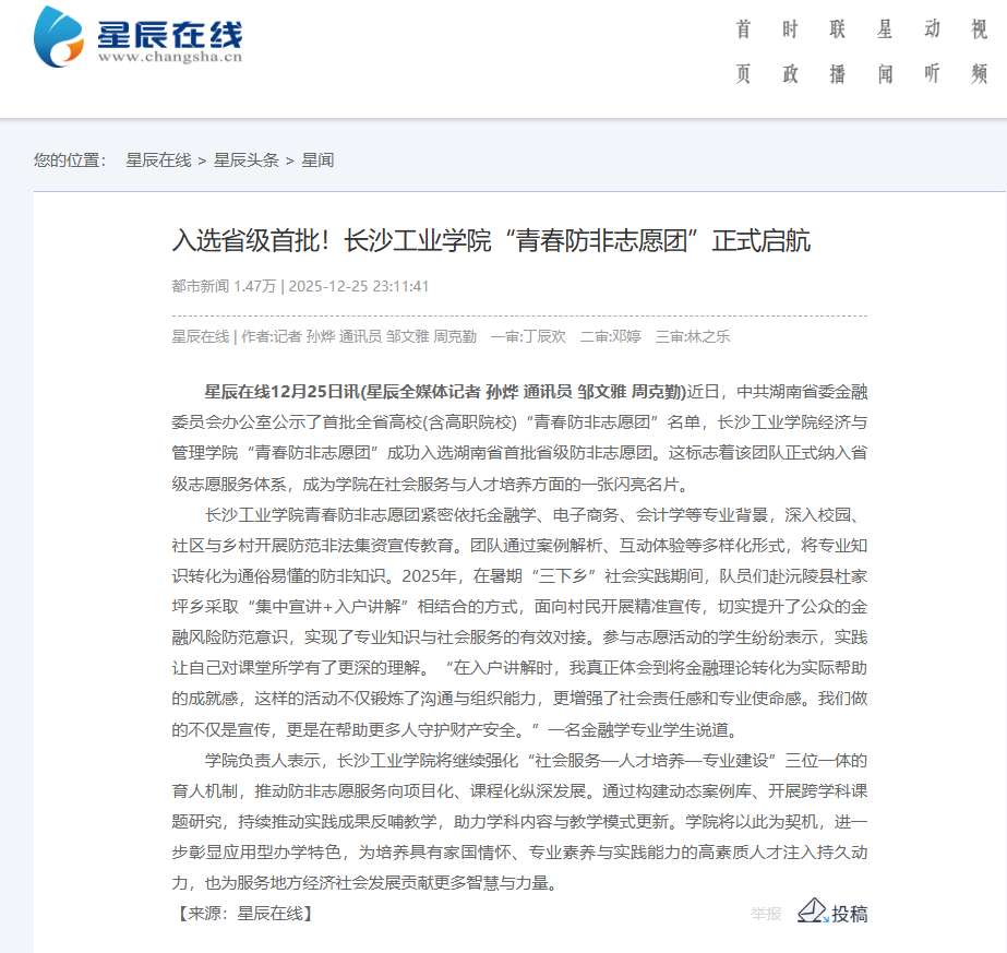 12月25日,星辰在线发布《入选省级首批!长沙工业学院“青春防非志愿团”正式启航》。