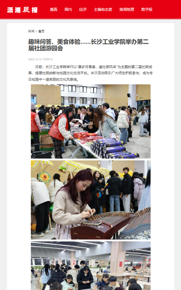 12月31日,潇湘晨报发布《趣味问答、美食体验……长沙工业学院举办第二届社团游园会》。