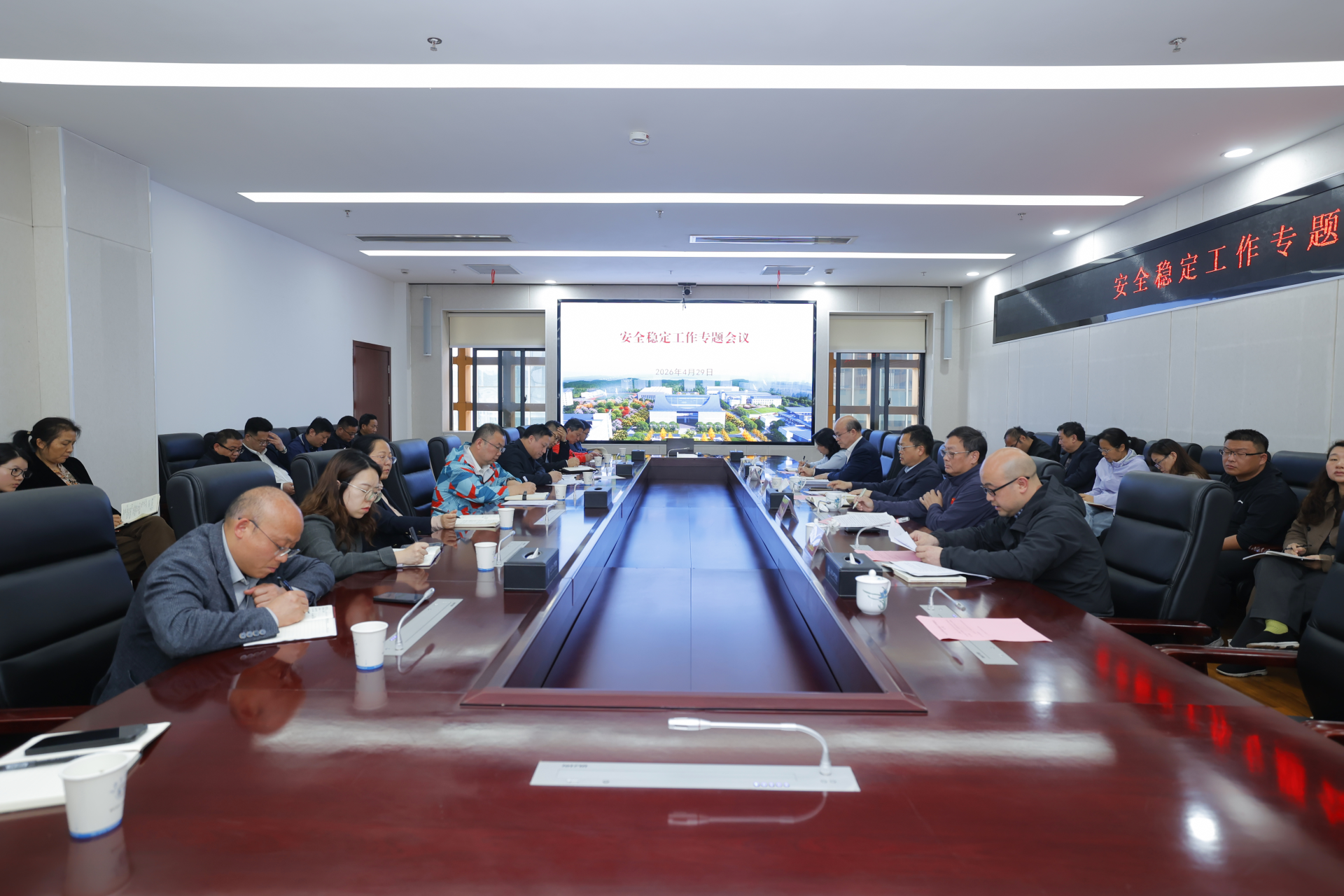 会议传达了2026年全省春季开学暨学校安全稳定工作视频会、全省高校安全稳定工作部署会、全国普通高校招生考试安全工作视频会的主要内容和有关精神,学习了省教育厅《关于切实做好“五一”期间全省教育系统安全工作的通知》要求,对学校今年安全形势进行了研判,结合今年安全工作重点,对全年校园安全稳定工作进行了部署,进一步明确了各部门安全任务分工。