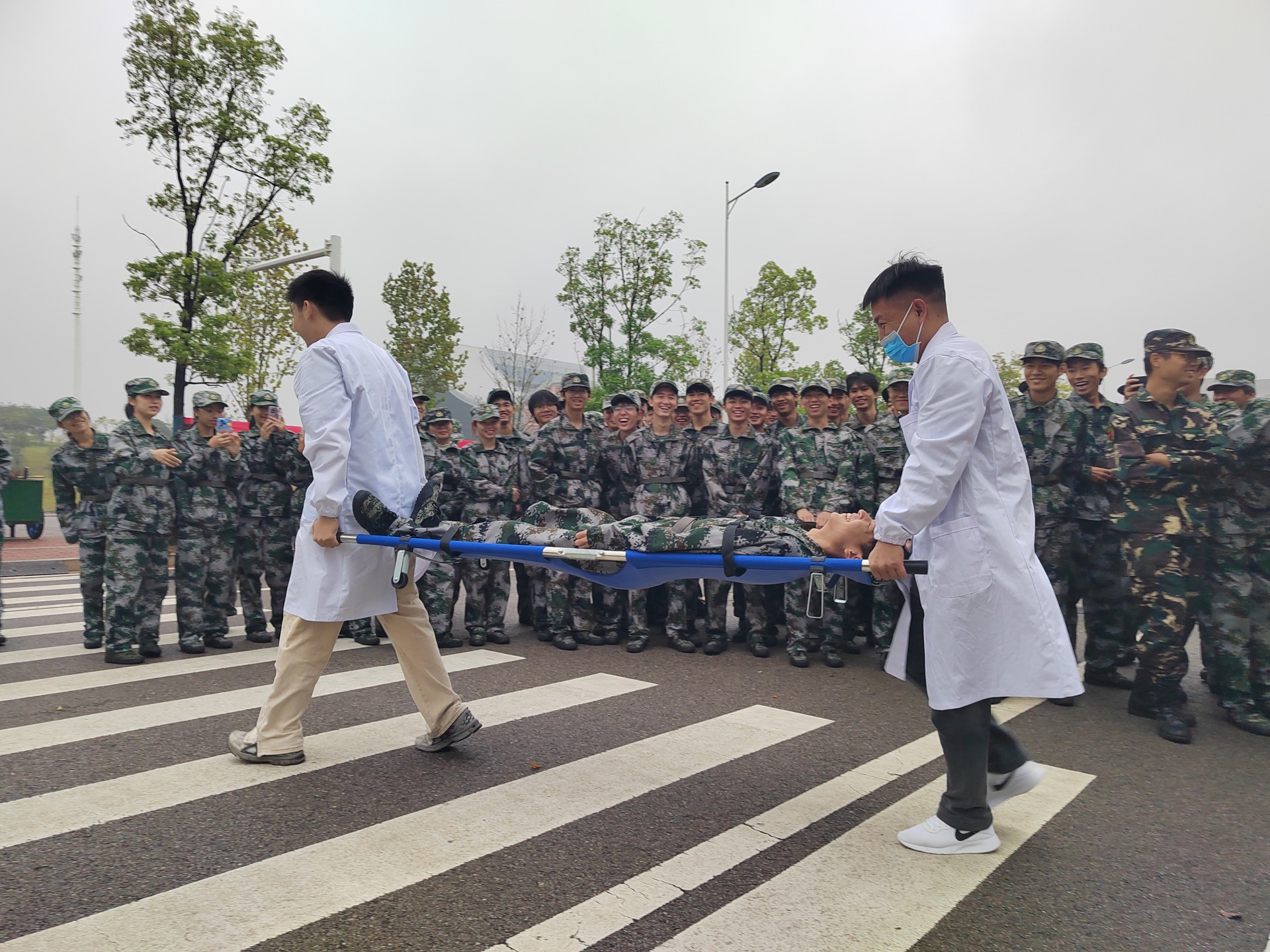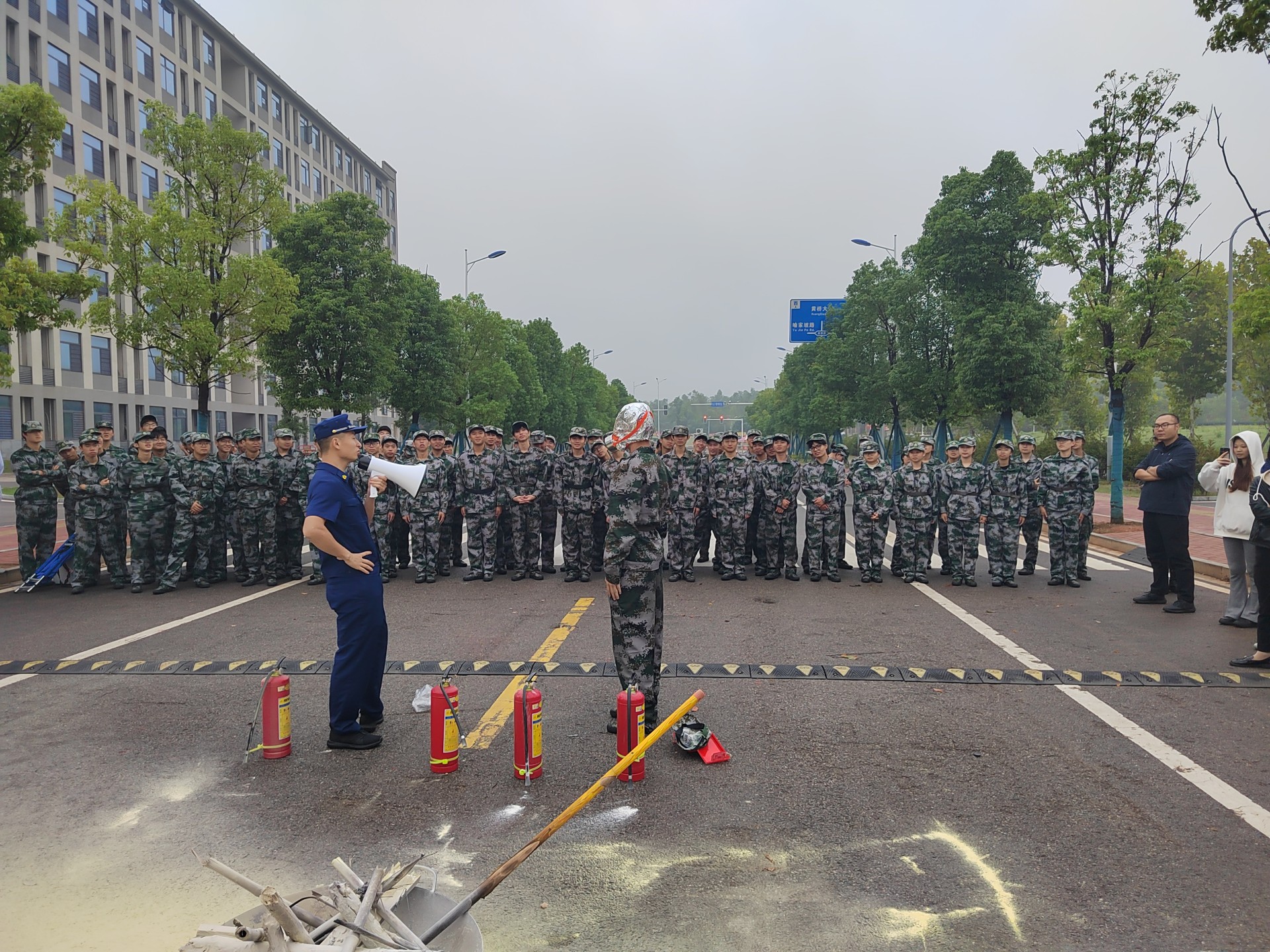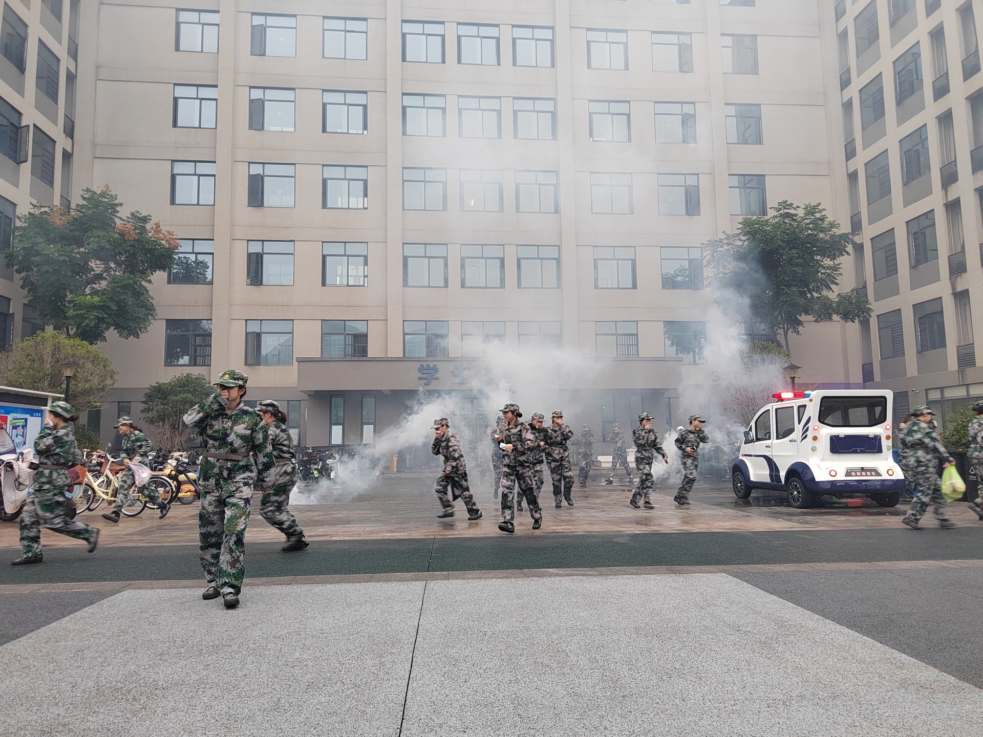 清晨7点,随着学生宿舍门口橘黄色浓烟的升起和消防警报声的响起,全体新生在宿舍管理人员、军训教官、保安人员的引导下,迅速采取弯腰低姿、捂住口鼻等防护措施,撤离至运动场指定集合点。整个疏散过程紧张有序,展现出了新生良好的应急素养与组织纪律性。