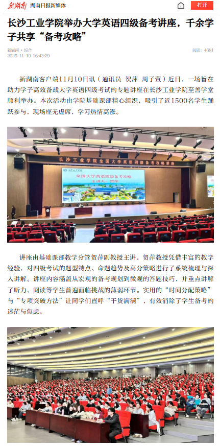 11月10日,新湖南发布《长沙工业学院举办大学英语四级备考讲座,千余学子共享“备考攻略”》。