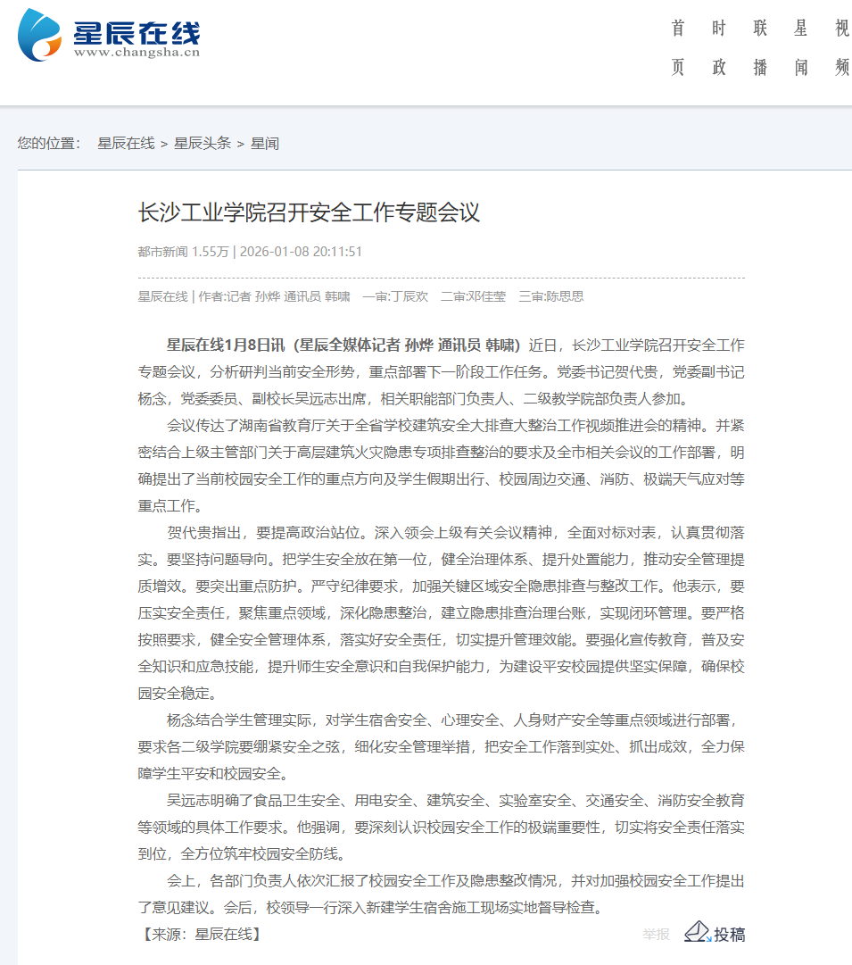 1月8日,星辰在线发布:长沙工业学院召开安全工作专题会议